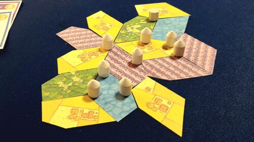 このゲームは特徴的な5角形のタイルを使った、4色地図問題をベースとしたタイル配置ゲームです。複雑なタイル配置で高得点を狙ったり、連続手番を狙ったり、最大ブドウ畑のボーナスを狙ったり、